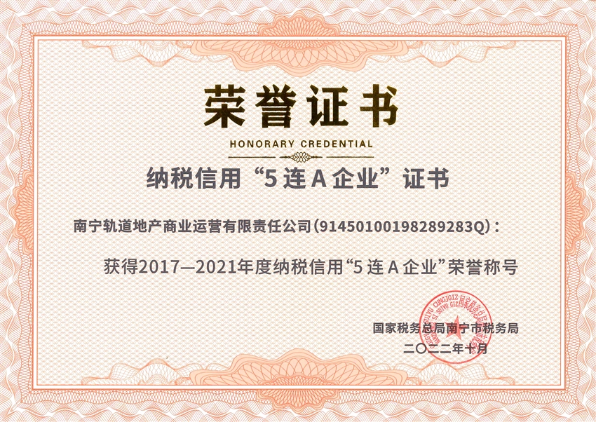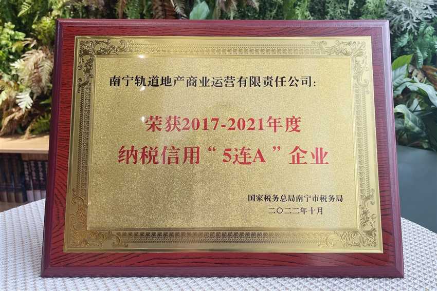 近日,軌道地產(chǎn)商業(yè)公司榮獲國(guó)家稅務(wù)總局南寧市稅務(wù)局授予的納稅信用“5連A”企業(yè)榮譽(yù)稱(chēng)號(hào)。獲此殊榮,不僅是稅務(wù)機(jī)關(guān)對(duì)軌道地產(chǎn)商業(yè)公司稅務(wù)管理工作的充分肯定,更為軌道地產(chǎn)商業(yè)公司走上高質(zhì)量發(fā)展之路提供了強(qiáng)有力的支撐。
