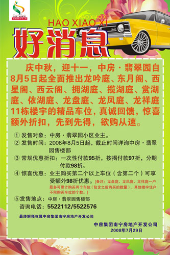 慶中秋,迎十一,中房·翡翠園自8月5日起全面推出龍吟庭、東月閣、西星閣、西云閣、擁湖庭、攬湖庭、賞湖庭、依湖庭、龍盤庭、龍鳳庭、龍祥庭11棟樓宇的精品車位,真誠回饋,驚喜額外折扣,先到先得,欲購從速。